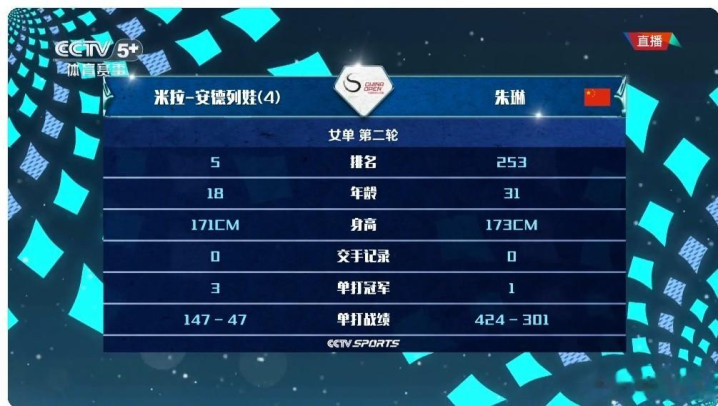 朱琳0-2输给安德列娃,遗憾被淘汰止步64强。
