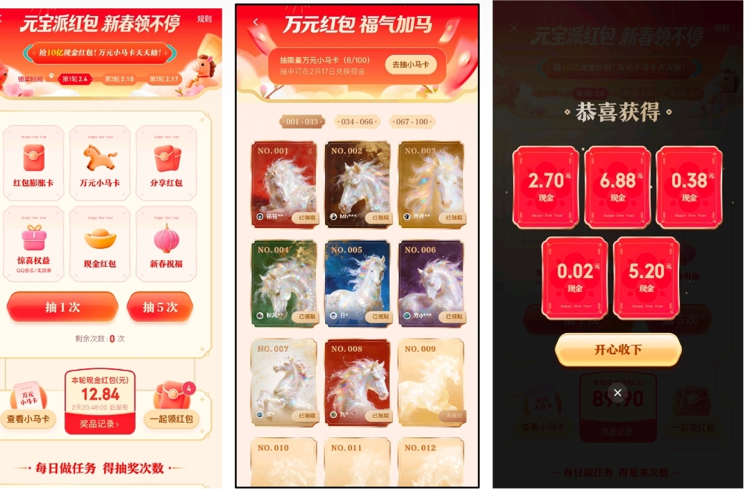 通过不断抽红包,用户每一轮的现金红包金额将逐步累加,在提现日,可直接将“该轮累计现金红包金额x该轮膨胀卡倍数”的现金总额存入微信钱包,据了解,膨胀卡倍数最高能达到5倍。万元小马卡限量100张,每张都拥有专属的设计,百只小马形态各异,幸运用户抽中之后可以在2月17日当天完成提现。分享红包支持转发给微信、QQ好友和社群,让元宝出钱、好友拆红包,分享红包被领取后,还能获得额外抽奖次数和现金红包。抽中惊喜权益的用户,则可以获取QQ音乐豪华绿钻VIP1天卡或元宝用户专享美团外卖大额神券。