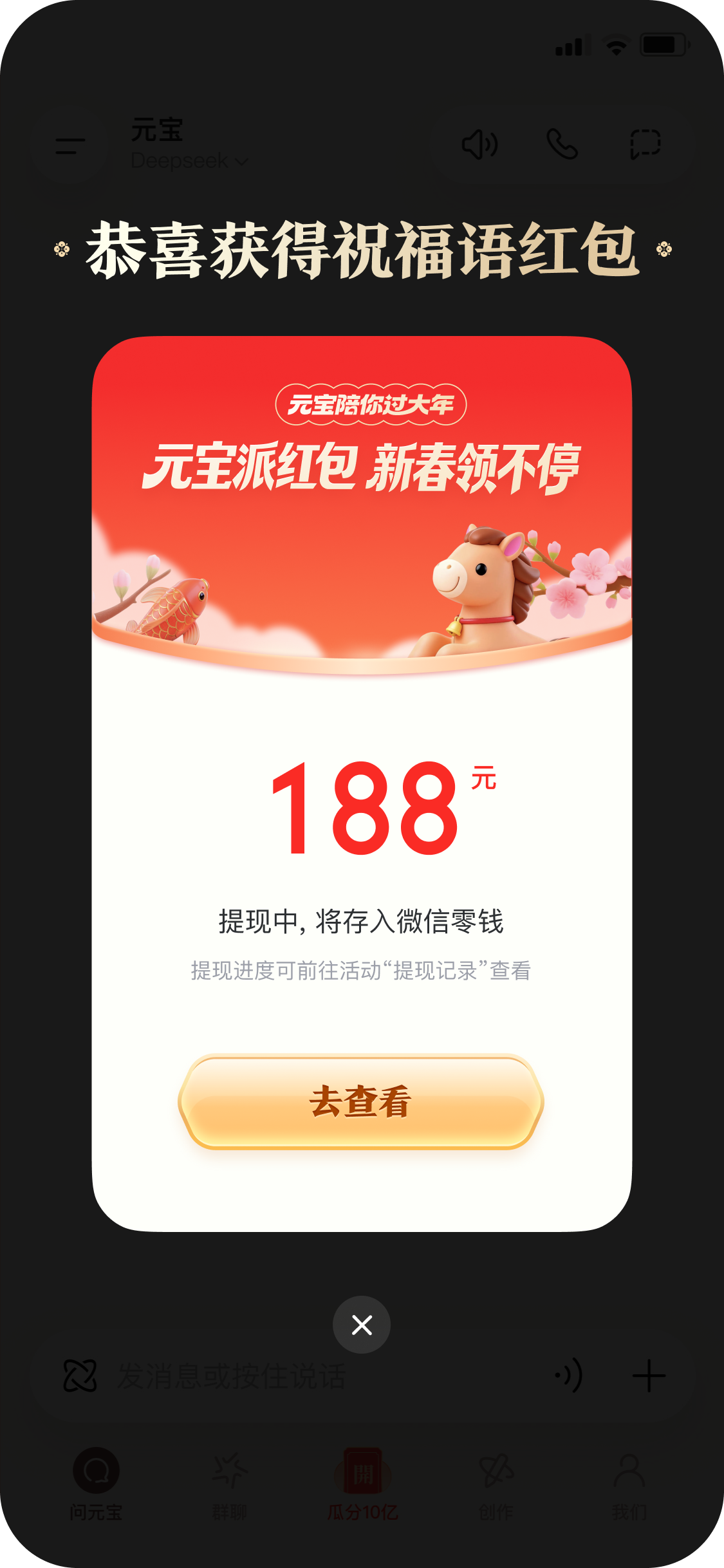 值得留意的是,主会场之外,元宝特别设置了“祝福语红包”。活动期间每天会通过不同渠道不定期下发红包祝福语,用户获得祝福语后打开元宝APP,在「问元宝」对话框输入指定祝福语并发送,就有机会触发祝福语红包,凭手气还能抢到188元、888元大额红包。